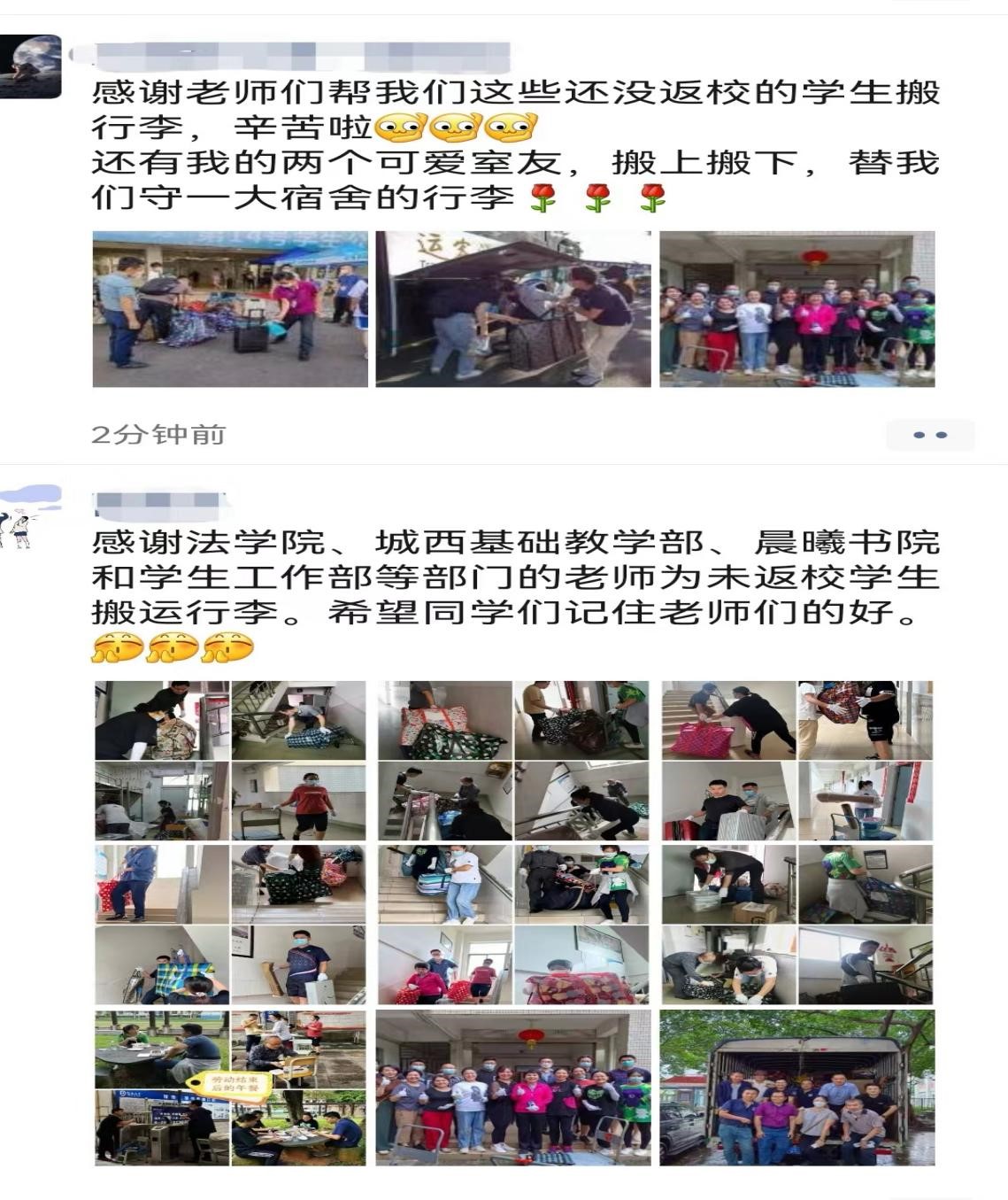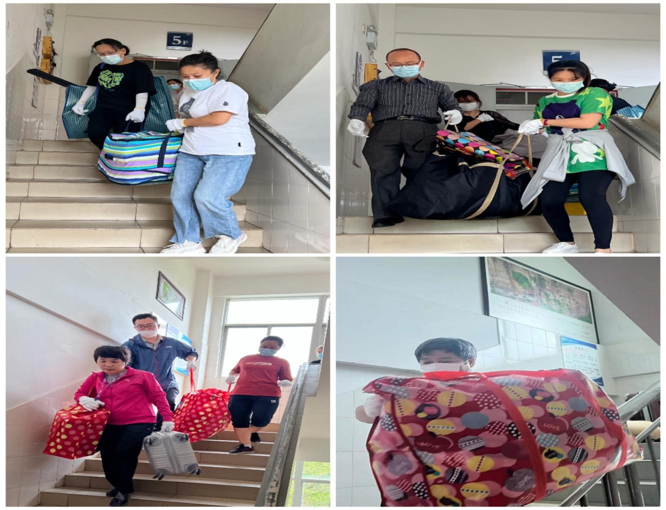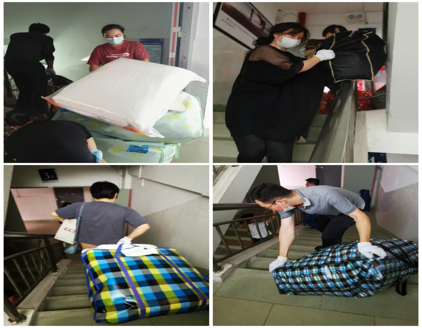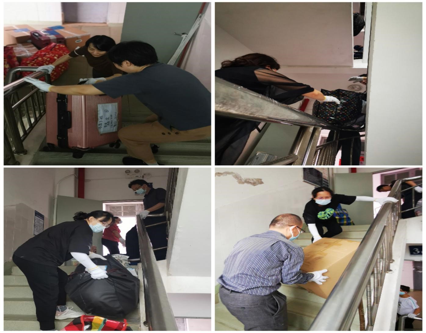 未返校的124名员工的行李物品存放在城西校区两栋宿舍楼的2层到7层共 60间宿舍中,大约有近750件大小的行李物品需要搬运。因为行李物品数量庞大、志愿者人数有限、楼层高和天气差等原因,给搬运工作带来了很大的困难,但在公司经理、书记的指导下,搬运工作井然有序。大家本着“一切为了员工,为了员工一切”的原则,合理分工、团结合作、毫无怨言,以高度的责任心、细致入微的作风展现了法学教师的风采。正所谓“人心齐,泰山移”,老师们你传我递、你推我拉、跑上跑下、汗流浃背的画面成为校园里一道道感人的风景线。在365亚洲体育网入口员工工作部和晨曦书院的支持下,大家用一个小时完成了32名男生行李的搬运,用3个小时完成了92名女生的行李搬运。中午12:40,行李搬运工作安全、有序、顺利完成。