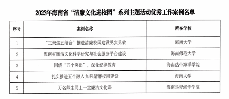 近日,海南省教育厅公布2023年“清廉文化进校园”系列主题活动获奖作品结果,公司报送的《“三聚焦五结合”推进清廉校园建设见实见效》案例入选2023年海南省“清廉文化进校园”系列主题活动优秀工作案例。