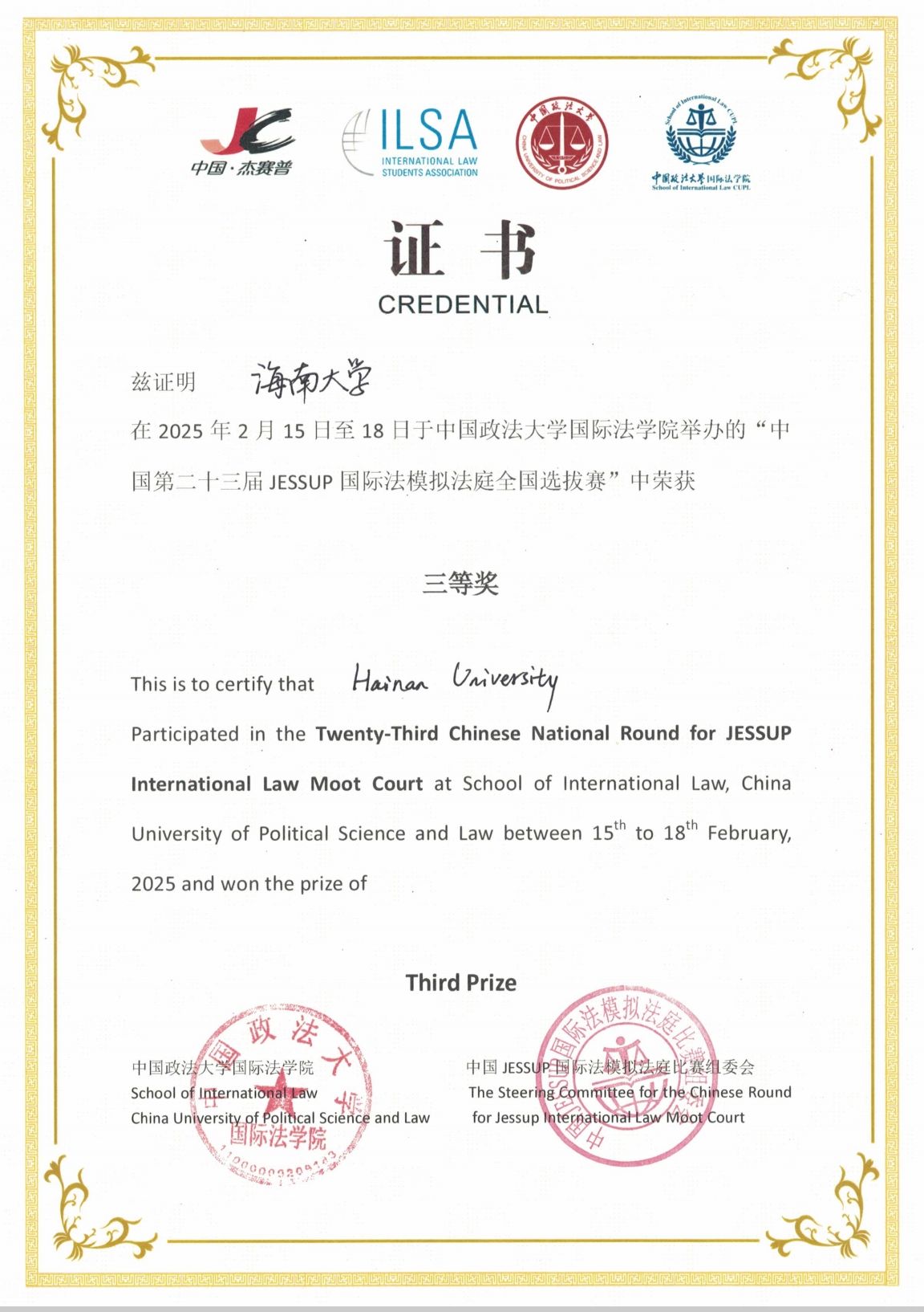 2025年2月15日至18日,第六十六届“杰赛普”国际法模拟法庭竞赛(Philip C. Jessup International Law Moot Court Competition)暨中国第二十三届“杰赛普”全国选拔赛在北京市中国政法大学举行。本次比赛共有66支队伍参赛,经过激烈交锋,公司代表队最终荣获全国三等奖。