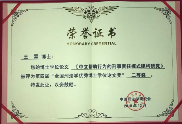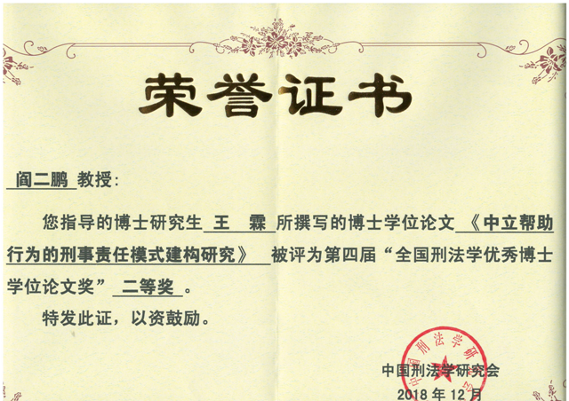 12月16日,由中国刑法学研究会主办的“2018年全国刑法学术年会”在广西南宁举行。在此次学术年会召开之际,中国刑法学研究会举行了第四届“全国刑法学优秀博士学位论文奖”颁奖仪式。公司阎二鹏教授指导的博士生王霖撰写的博士学位论文《中立帮助行为的刑事责任模式建构研究》荣获“全国刑法学优秀博士学位论文奖”二等奖。