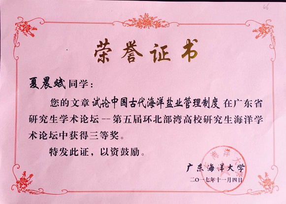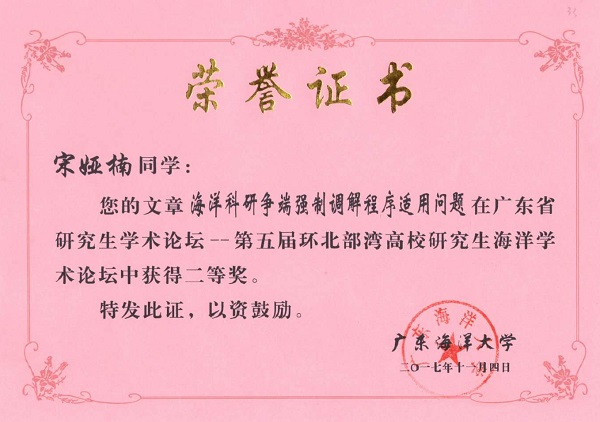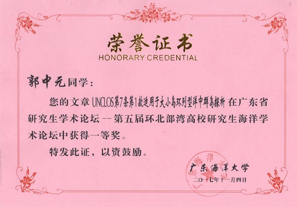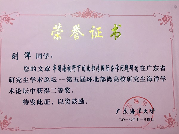 本届论坛共收到全国17所高校研究生投稿,经审查编入论文共344篇,经论坛组委会聘请专家评审,共评选出优秀论文一等奖20名,二等奖40名,三等奖60名。公司郭中元同学的论文《UNCLOS第7条第1款适用于大小岛环列型洋中群岛探析》荣获一等奖,宋娅楠同学的论文《海洋科研争端强制调节程序适用问题 》和刘洋同学的论文《半闭海视野下的北部湾国际合作问题研究》荣获二等奖,夏晨斌同学的论文《试论中国古代海洋盐业管理制度》荣获三等奖。 (图 /文:刘洋)