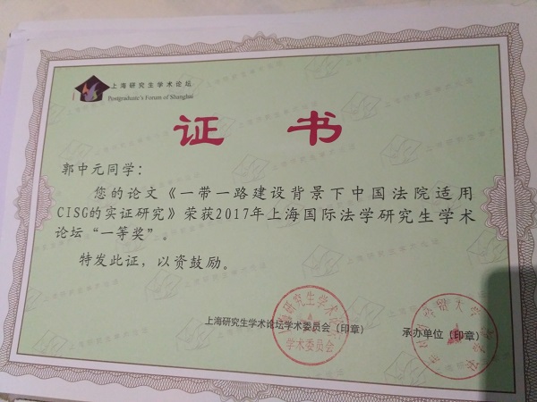 公司国际法学研究生郭中元所撰写的《“一带一路”建设背景下中国的法院适用CISG的实证研究》一文,荣获本次论坛一等奖。并获邀做专题发言。