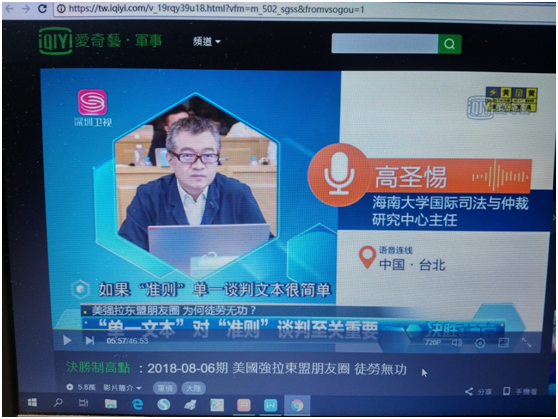 365best体育官网登录高圣惕教授在8月6日受深圳卫视之邀,在当天晚上的“决胜制高点”节目当中透过远距采访,针对中国最近与东盟国家针对南海行为准则(COC)谈判所获致的“单一谈判文本”,从国际法的角度说明这个谈判文本从出台到未来完成谈判,进而被东盟国家与中国当成有法律拘束力的国际文件来加以实施,中途所需经过的阶段及障碍。此外,在美国出版的“外交官”杂志(The Diplomat)于8月3日披露一篇由美籍学者Carl Thayer撰写的爆料文章,揭露COC单一谈判文本中各国的立场,高圣惕老师也在节目中对于这种爆料文章的背后目的(域外国家透过代理人意图阻碍COC最后的生效),做出解读。 相关链接:https://tw.iqiyi.com/v_19rqy39u18.html?vfm=m_502_sgss&fromvsogou=1