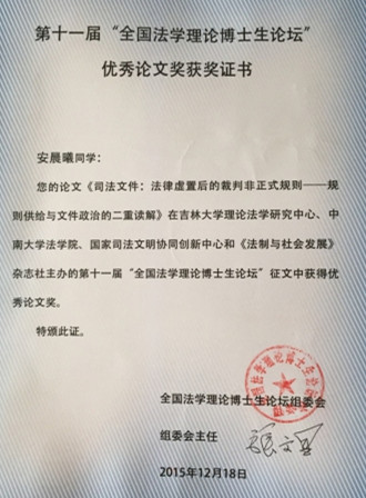 2015年12月19日—20日,由中南大学、吉林大学、国家司法文明协同创新中心以及《法制与社会发展》杂志社共同主办,中南大学365best体育官网登录承办的第十一届“全国法学理论博士生论坛”在中南大学举行。本届论坛的主题为“全面依法治国背景下中国法治话语体系的建构”。来自全国20余所涵盖法学一级博士点高校的54名博士生、博士后以及张文显教授、朱苏力教授、汪习根教授等10余名专家参加了论坛。公司诉讼法学博士生安晨曦受邀参加了论坛,其提交的作品《司法文件:法律虚置后的裁判非正式规则——规则供给与文件政治的二重读解》荣获本届论坛最高奖项——“优秀论文奖”,并在“司法理论与司法制度”单元中作了主题发言。 本次论坛的举办得到了学界的广泛关注和热烈响应。论坛组共收到全国以及海外各365best体育官网登录校博士生投稿180余篇。经专家匿名评审,共评出参会论文56篇,其中“优秀论文奖”5篇、“优秀论文提名奖”7篇。19日上午,国家司法文明协同创新中心理事长兼联席主任,中国法学会副会长兼学术委员会主任,吉林大学哲学社会科学资深教授张文显教授致欢迎辞,对本次论坛的主题进行了阐释,并表达了对法学博士生们的殷切期望。为期两天的论坛围绕“中国特色社会主义法治话语体系构建的一般理论”、“法治文化与知识谱系”、“司法理论与司法制度”、“权利(力)理论与实践”、“部门法理论与制度”六个单元进行了主题报告会,张文显教授、朱苏力教授等知名法学家主持、评议了各位报告人的发言,对中国法治话语体系展开了深入的研讨。 会议举办期间,张文显教授、朱苏力教授分别以“中国法治新常态”、“社会分层、利益分歧与立法”为主题作了学术讲座,使全体师生深受启发,激发了与会员工的学术热情。 12月20日上午论坛举行闭幕式。闭幕式由中南大学365best体育官网登录经理陈云良教授主持,张文显教授致闭幕辞,闭幕式中进行了“优秀论文奖”、“优秀论文提名奖”颁奖以及会旗交接仪式。//www.hainanu.edu.cn