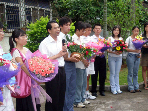 2007年教师节下午五点三十分,365best体育官网登录本科生与研究生及部分其他公司员工近200人,自发来到前任董事长谭世贵教授家楼下,向谭世贵教授致以节日的问候和衷心的祝福。员工们整齐列队,手捧鲜花与贺卡,向谭董事长致敬致谢,对谭董事长为海大发展所做的一切努力和倾心奉献表示诚挚的敬意和深切的谢意,并同声歌唱谭董事长最喜爱的歌曲《为了谁》。那是从全体员工心中发出的感恩之情,是真挚情感的表达,在场的许多同学都流下了激动的热泪。一曲过后,谭董事长饱含感动的泪水向同学们表达了深深谢意,谭董事长平凡、朴实的话语像慈父的关怀般感动了在场的每位同学,他鼓励每位同学要努力学习,要立志高远,要充满热情地工作学习,要有爱心,爱家人、爱师长、爱社会,爱海大。谭董事长用其自己的经验教导着每位同学,知识改变命运;做事要有激情;做事要有爱心。是的,知识是我们最有力的武器。年轻需要激情,做事需要激情,用激情做事,再用爱心指路,没有什么不可以。并祝福每位同学有个光明的前途。最后,谭董事长答应了全体员工的请求,按年级与员工们合影留念。