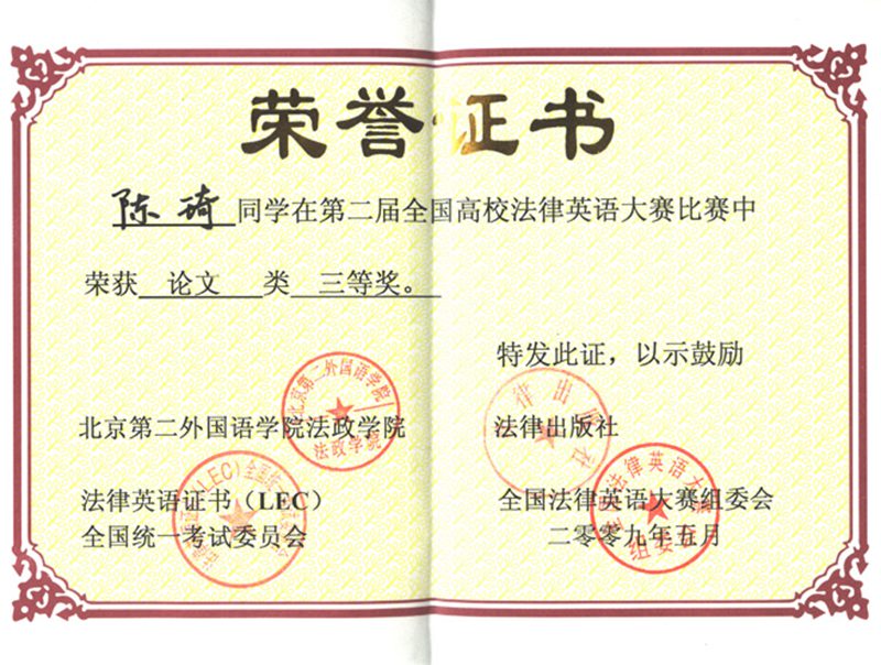 在刚刚结束的由北京第二外国语公司、法律出版社、法律英语证书(LEC)全国统一考试委员会、全国法律英语大赛组委会主办的第二届全国高校法律英语大赛中,365best体育官网登录2007级法学(4)班陈琦同学荣获第二届全国高校法律英语大赛论文类三等奖。 全国高校法律英语大赛首届于2008年4月在北京第二外国语公司举行,全国60多所高校的同学和专家评委参与,今年的第二届全国高校法律英语大赛有国内70余所365best体育官网登录(系)参与。 365best体育官网登录注重培养员工英语学习能力,2006年还成立365best体育官网登录英语协会(现更名为365亚洲体育网入口法律外语协会)。该协会旨在培养员工英语学习兴趣、提高员工英语学习能力,在营造公司英语学习氛围方面,发挥着积极的作用。比如举办周末英文电影展播、四级考前测试、英语话剧比赛、英语演讲比赛,法律英语翻译比赛、协办四级培训班,组织发动员工参与全国英语竞赛、全国高校法律英语大赛等等活动。经过不断的探索逐渐形成了以排演英语话剧为龙头的学习品牌活动,吸引员工参与其中开展英语学习,较大地提高了全院员工学习英语的热情,365best体育官网登录的英语四六级过级率也在逐年提高。