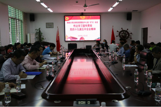 叶英萍书记传达了公司党委常委会暨理论学习中心组(扩大)学习会的会议精神,强调了全院深刻认识学习贯彻党的十九届五中全会精神的重要意义,并结合“三个带头”“三个全覆盖”“三个培训班”“三个重点”等切实在世界一流法学学科、海南自由贸易港建设中展现新作为。