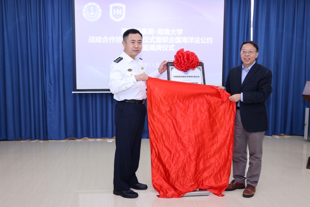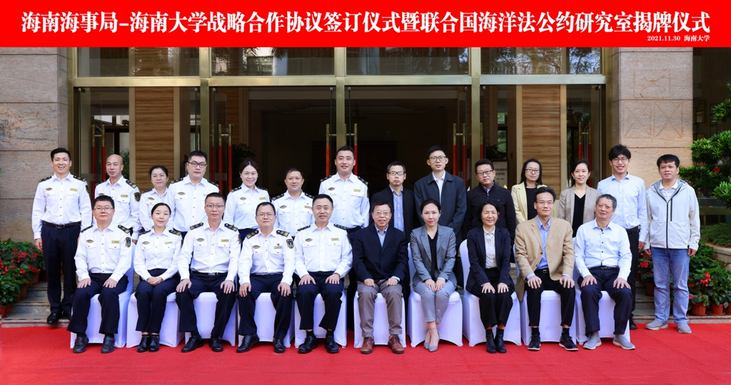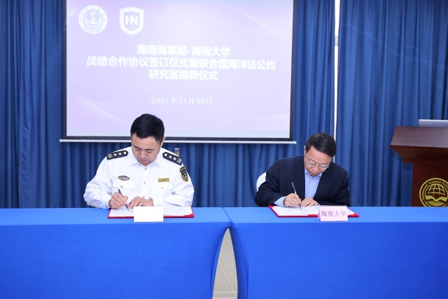 365亚洲体育网入口与海南海事局于2021年11月30日在365亚洲体育网入口举行战略合作协议签订仪式暨联合国海洋法公约研究室揭牌仪式。365亚洲体育网入口党委常委、副董事长王崇敏,海南海事局副局长吴平生,双方职能部门负责人以及联合国海洋公约研究室成员出席了本次活动。