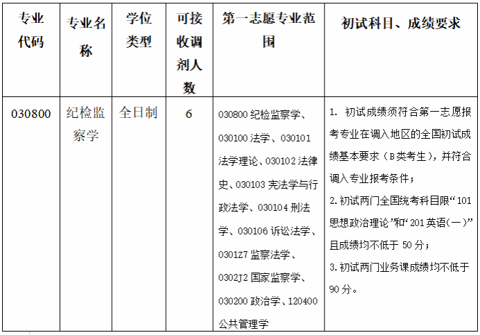 纪检监察学专业计划调剂招收6人,复试人数比例为160%,进入复试人数10人(不足1人按1人计)。
