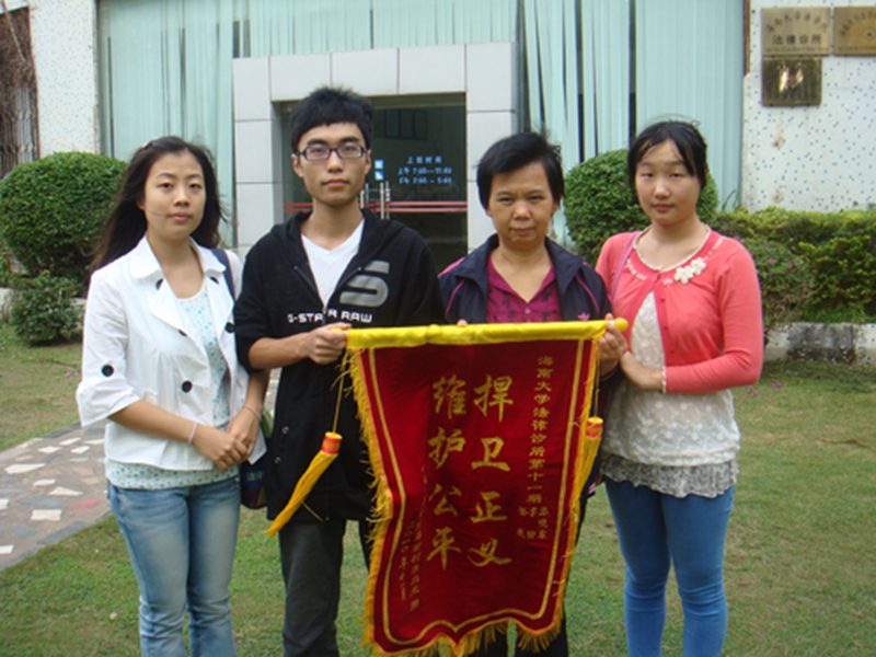唐某与海南含元实业有限公司和海南联通海口分公司之间发生的劳动纠纷,在诊所学员李玲、姜晨、张晓东的积极努力下,为当事人解决了实际困难,11月24日,当事人唐某来到365亚洲体育网入口法律诊所,将一面鲜艳锦旗交给法律诊所的学员们。这起困扰当事人近半年的劳动纠纷,在法律诊所三位学员的共同努力下,至此画上了一个圆满的句号。