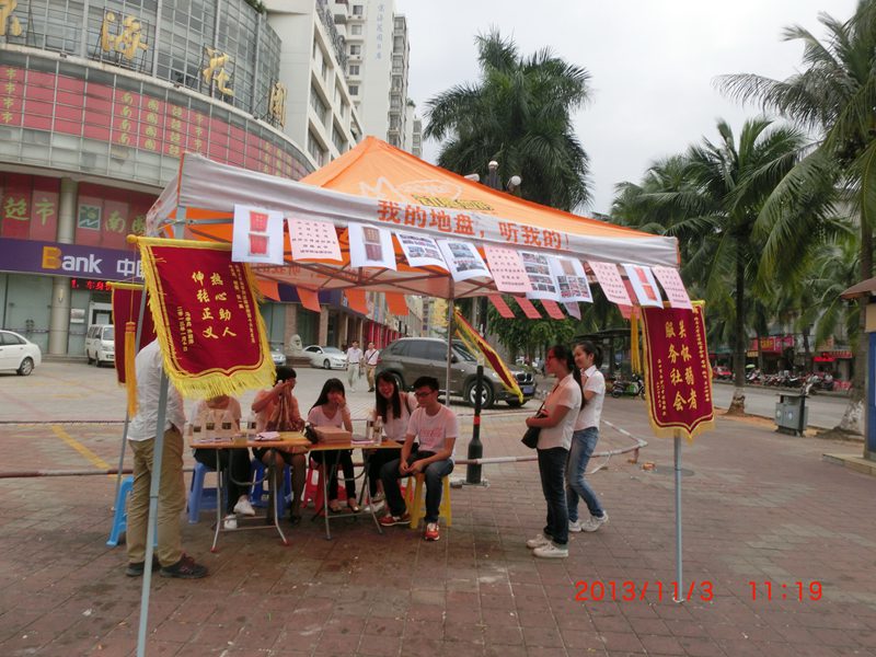 2013年11月3日,365best体育官网登录法律诊所第十八期学员7:30出发,大家带着500份宣传单、桌子、帐篷等活动需要的物品来到了海甸三东路口(京海花园)开展了法律宣传活动,此次活动由学员自主组织,伍奕老师到了现场指导此次宣传活动。