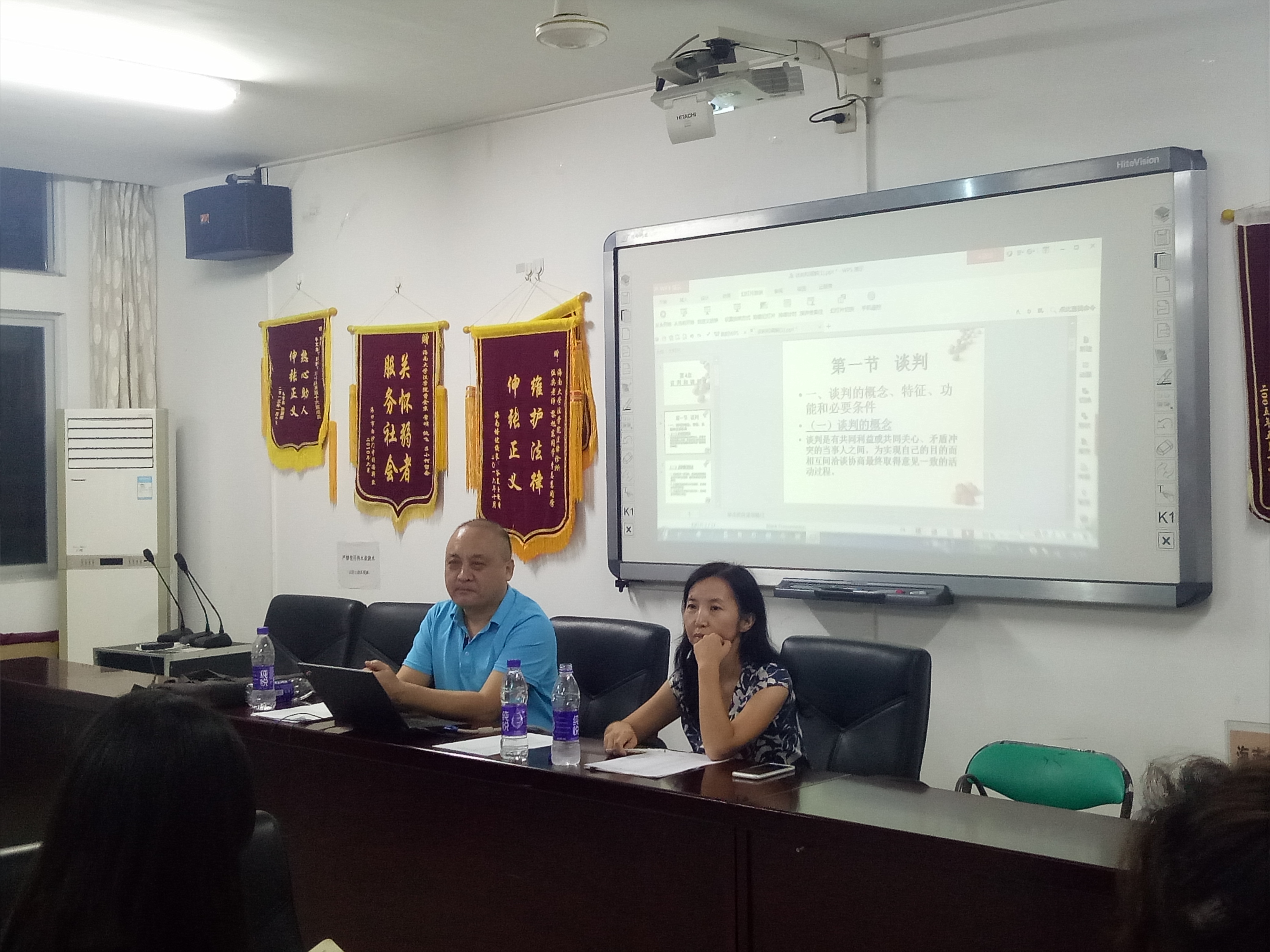 本次课的主讲老师为董万程教授和王子晏副教授,课堂内容为谈判与调解。课堂分为两个板,第一板块为掌握沟通、调解、谈判的各种方法;第二板块是通过实训体验进攻、防御的技巧,了解退让、固守的底线。